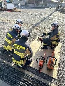 東消防署出張所では救助事案にいち早く対応するために消防車に初動対応が可能な救助資機材を積載しています。今回はそれらの資機材を使用し訓練を行いました。
