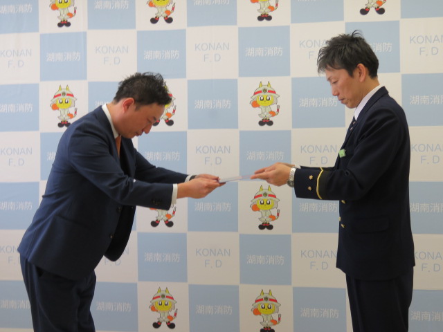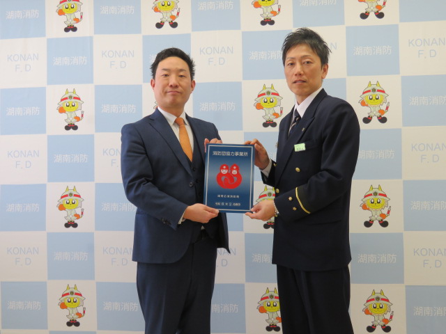 湖東開発株式会社様は、代表者を含め複数の従業員が消防団員として積極的に活動されるとともに、湖南防火保安協会「災害時消防活動等支援登録事業所」に登録するなど、地域の消防防災体制の充実強化に寄与されています。