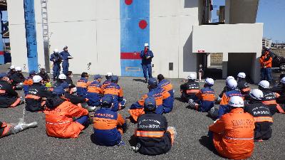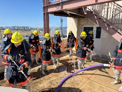 今回の訓練では、東消防署職員が林野火災対応と水防要領について講義を行った後に、林野火災におけるIP無線の活用と遠距離中継放水時の機関運用能力の向上を目的とした遠距離中継放水訓練、水防活動における月の輪工法の作成要領の習得を目的とした水防活動訓練の2つの実動訓練を行いました。