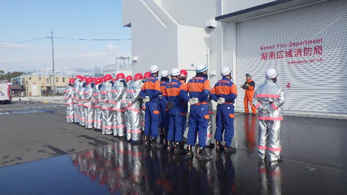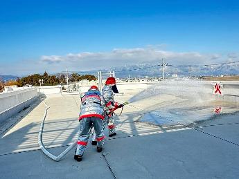また、同時並行で実施されていた消火訓練では、平面に加えて建物の屋上までホース延長を行い、迅速な消火活動が実施できました。