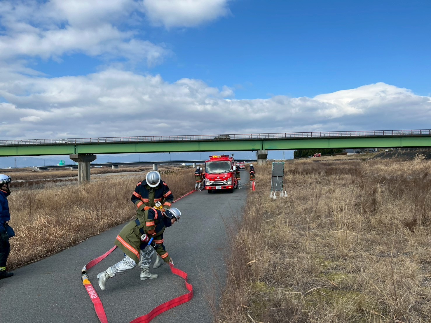 消防団によるホース延長!