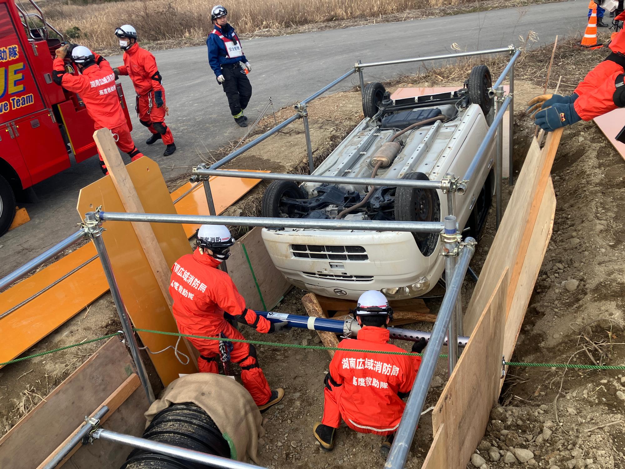 埋没した車両から救出活動!