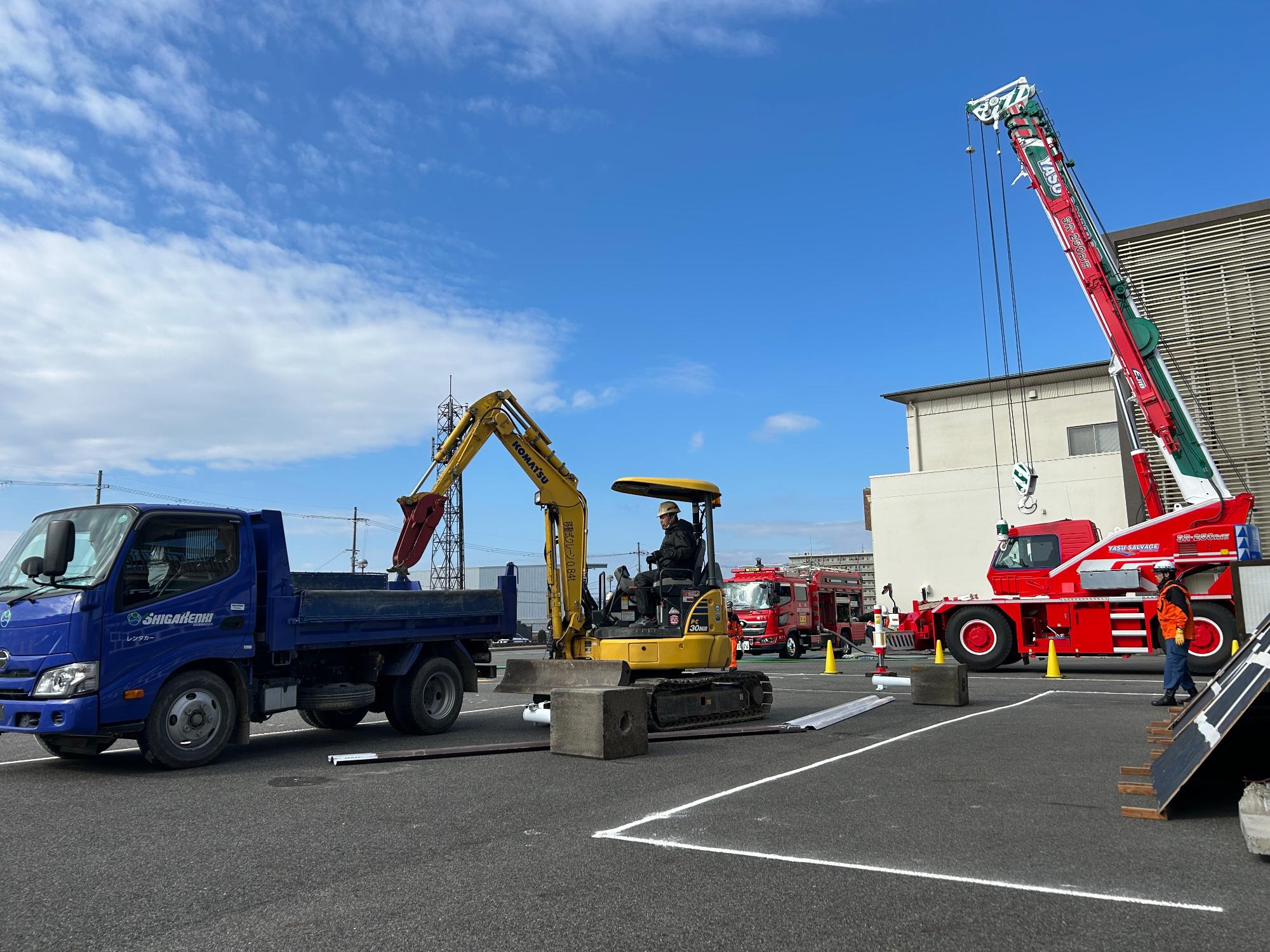 また、倒壊建物災害対応ブースでは、建設業協会が保有するクレーン、バックホーを活用し、重量物の排除および要救助者の救出、救護活動にあたりました。